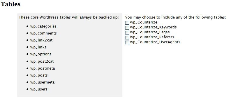 - 在 Table 区域你可以看到默认的备份表,旁边还有一些可选的表(有插件产生的);